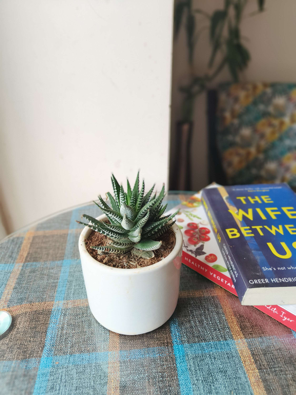 Plant: Haworthia Succulent Location: Bright Indirect Light/Partial ShadeWater: Once a weekPot: White Ceramic Pot Size: 3.5×4 inchHeight with plant: 5 inch