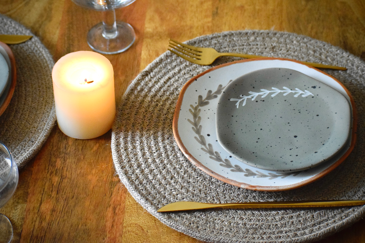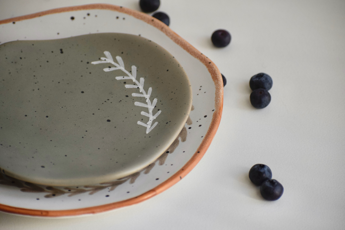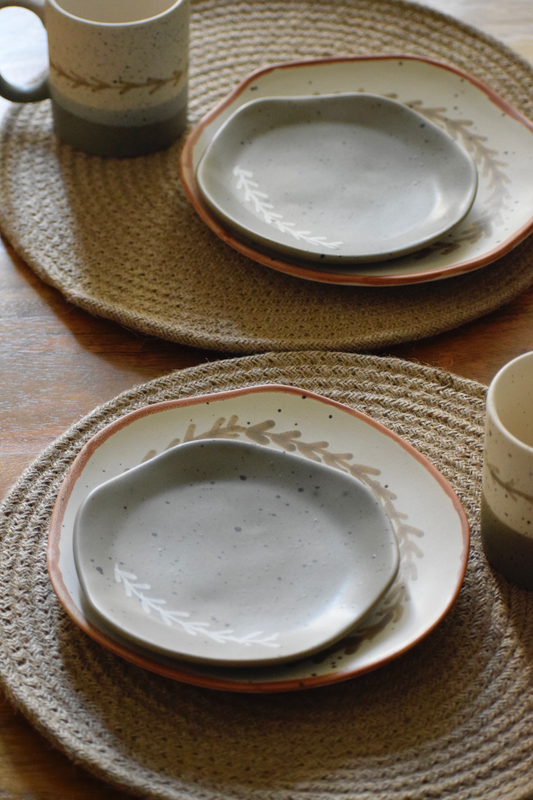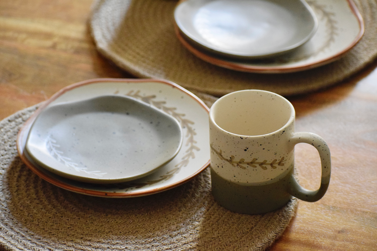 Meal set of 2 Large plate, 2 small plate, 2 mugsBeautiful hand painted dinner set with leaves pattern. A meal that looks good, tastes good. Enjoy your meals with our day to night meal plates and mug combo. The unique shape gives an aesthetic look to your table. These are…